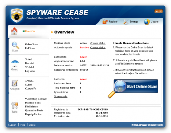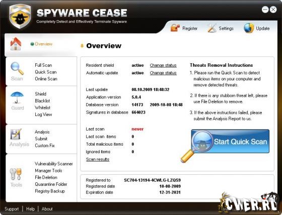 Spyware Cease - программа для защиты вашего компьютера от шпионских атак, вредоносных троянских программ, которые могут вызвать нежелательные всплывающие окна, замедлить производительность вашего ПК или "снять" с системы какую-либо секретную информацию, без вашего ведома, в виде паролей доступа, номеров кредитных карт и т.п. С помощью данной программы вы сможете защитить ваш ПК от различных шпионских модулей.