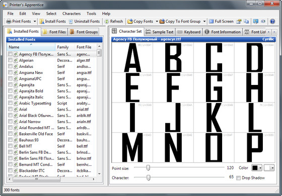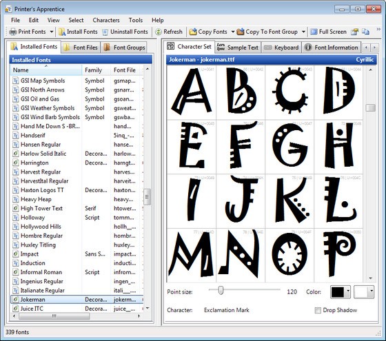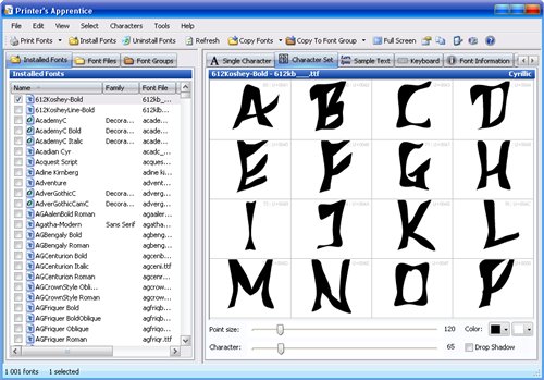 Printer's Apprentice - это современный 32-битный менеджер шрифтов для Windows. С его помощью можно просматривать неустановленные шрифты, печатать образцы TrueType, Type 1 и OpenType шрифтов, распечатывать каталоги шрифтов в разных форматах и устанавливать (или удалять) группы шрифтов всего за несколько кликов. Сильной стороной программы является способность легкой работы с неустановленными шрифтами, находящимися на CD или на диске. Printer's Apprentice может распечатывать точнейшие листинги с CD, не устанавливая оттуда ни единого шрифта.