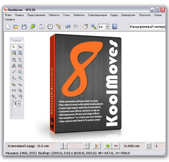 KoolMoves - программа для создания анимационных эффектов в формате Macromedia Flash (.SWF) и кадров для анимированных GIF-файлов и анимации в других популярных форматах. В программе имеется: инструментарий для рисования объектов различной формы, импорт векторной графики, добавление звуковых файлов, множество различных эффектов, в том числе текстовые эффекты, добавление действий к тексту и кадрам. Программа также имеет готовые шаблоны, библиотеку кнопок и векторных заготовок.