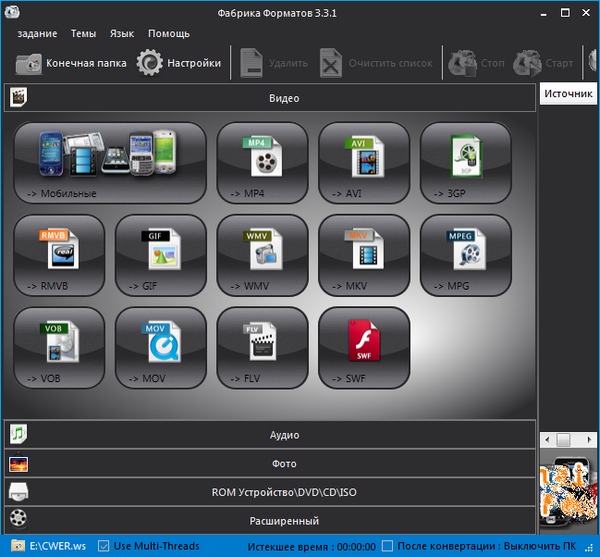 FormatFactory - многофункциональный конвертер различных файлов мультимедиа. Имеет рад дополнительных функций, превращающих FormatFactory в универсальный инструмент для работы с мультимедийными файлами разных форматов. Поддерживается конвертация популярных видеоформатов в MP4, 3GP, MPG, AVI, WMV, FLV, SWF, а также конвертация аудиоформатов в MP3, WMA, MMF, AMR, OGG, M4A, WAV. В FormatFactory есть функция преобразования изображений в форматы JPG, BMP, PNG, TIF, ICO, GIF, PCX, TGA. Среди дополнительных возможностей FormatFactory есть такие, как увеличение и вращение изображений, присвоение им тегов, а также восстановление поврежденных аудио и видеофайлов.