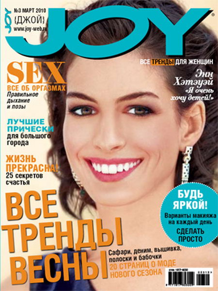 Развлекательный глянцевый женский журнал, создающий отличное настроение! Читательницы Joy — жизнерадостные модницы, которые относятся к жизни легко и весело, путешествуют, знают последние направления в моде и красоте, они сексуальны и энергичны. Основные темы журнала: звезды, красота, мода, мужчины, секс и флирт.