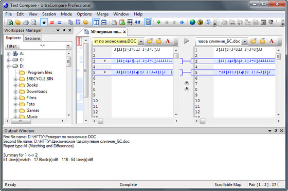 IDM UltraCompare - текстовый редактор для нахождения отличий в документах. UltraCompare может помочь найти разницу между файлами, папками и Zip-архивами. Возможность автоматической интеграции в UltraEdit-32 или UEStudio. Программа может выполнять сравнение по тексту или же по двоичному коду. UltraCompare поддерживает работу с командной строкой, есть возможность игнорирования заданных фрагментов. В строке состояния отображается количество различных блоков, также предусмотрена возможность поиска различий в папках путём рекурсивного сравнения директории и всех её поддиректорий. Программа пригодится программистам, системным администраторам, тем, кто имеет дело с большими документами и редактированием текстов.