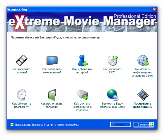 eXtreme Movie Manager - Лучшая программа для ведения домашней фильмотеки. Для каждого фильма предоставлено более 70 (!) полей описания, разделенных по подгруппам. Возможность импорта данных со специализированных сайтов, есть возможность создания собственного импорт-скрипта. Программа поддерживает все существующие сегодня форматы файлов от *.avi и *.mpg до RealMedia. При помощи eXtreme Movie Manager можно не только вести учет коллекции, но и воспроизводить видеофайлы. Программа имеет возможность сканировать диск на наличие имеющихся на винчестере мультимедийных файлов, разрешение которых вы укажете в настройках, и автоматически составляет из них каталог.