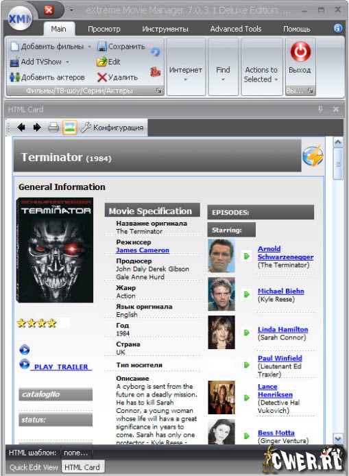 eXtreme Movie Manager - Лучшая программа для ведения домашней фильмотеки. Для каждого фильма предоставлено более 70 полей описания, разделенных по подгруппам. Возможность импорта данных со специализированных сайтов, есть возможность создания собственного импорт-скрипта. Программа поддерживает все существующие сегодня форматы файлов от *.avi и *.mpg до RealMedia. При помощи eXtreme Movie Manager можно не только вести учет коллекции, но и воспроизводить видеофайлы. Программа имеет возможность сканировать диск на наличие имеющихся на винчестере мультимедийных файлов, разрешение которых вы укажете в настройках, и автоматически составляет из них каталог.