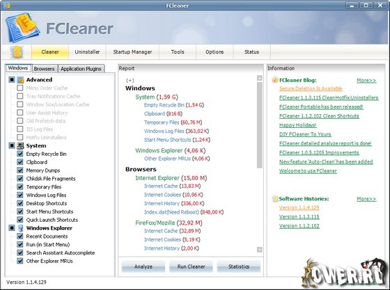 FCleaner чистит жесткий диск от всех ненужных файлов и освобождает драгоценное пространство. Программа находит временные файлы, списки недавних документов, автозаполнения, файлы в Корзине и другие данные. Пользователь самостоятельно выбирает, какую информацию удалить. Помимо очистки диска в утилите есть менеджер автозагрузки и инструмент для деинсталляции приложений. В статистике отображается объем освобожденного места.