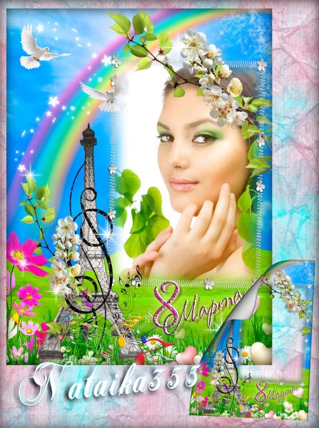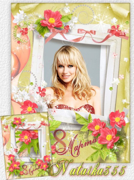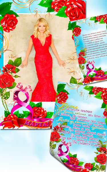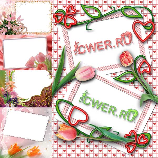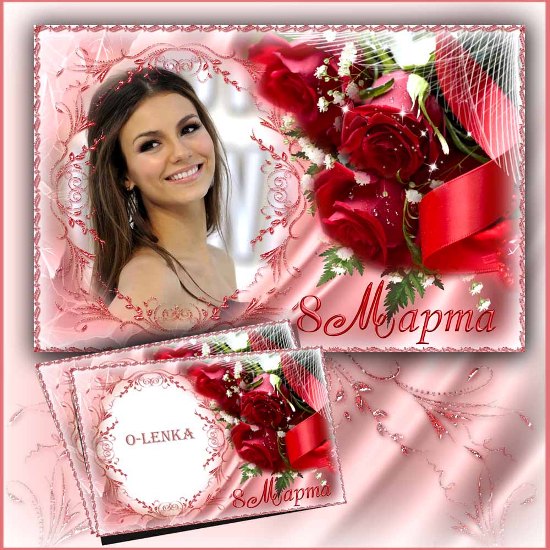 Многослойная женская рамка с розами, лентами и сердечками для оформления фото к празднику 8 Марта.