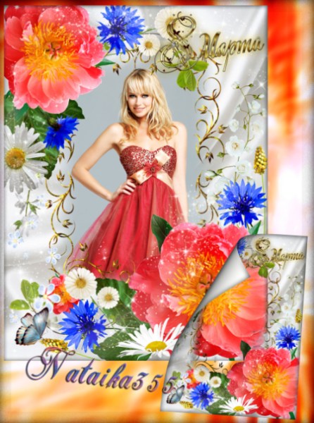 Яркая рамка с розами, васильками и ромашками, для украшения женского фото к празднику 8 Марта.