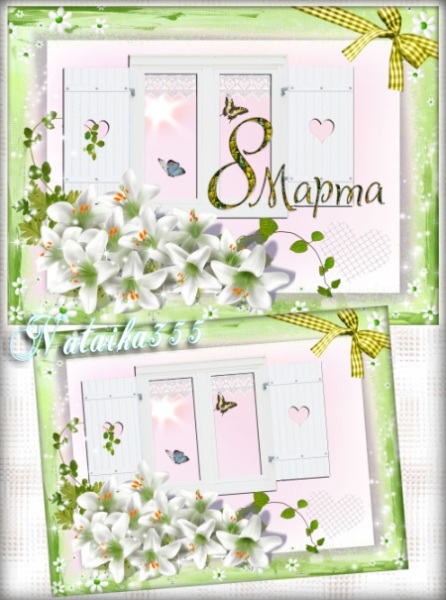 Многослойный исходник в нежных тонах с лилиями на фоне открытого окна для дизайна в фотошопе.