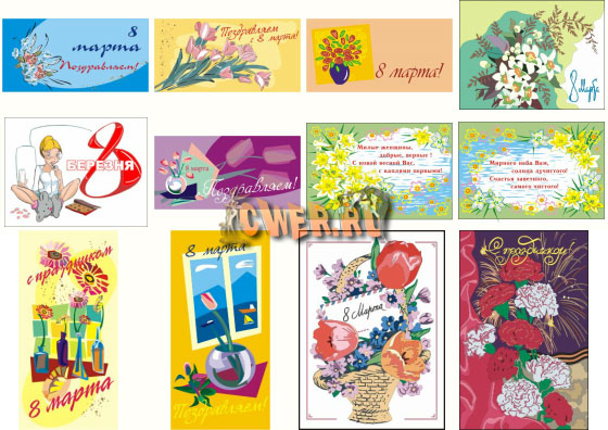 Коллекция графики к 8 марта. Все в векторе. Можно напечатать открытку, плакат, листовку. В комплекте много готовых текстов поздравлений в стихах.