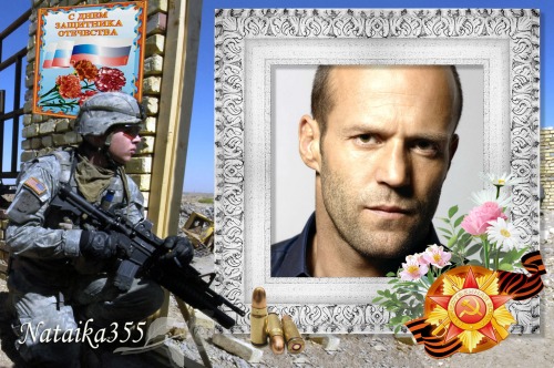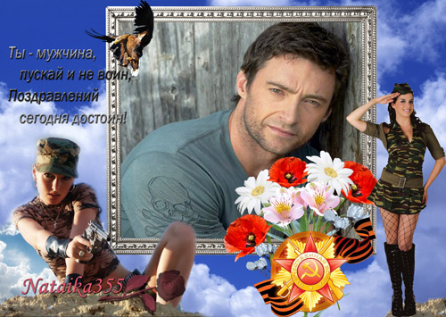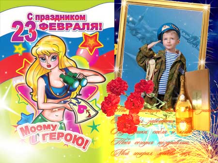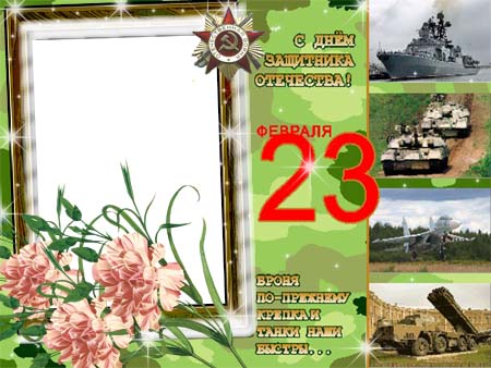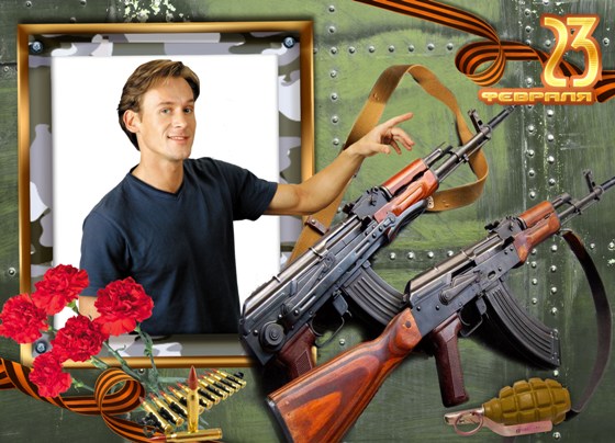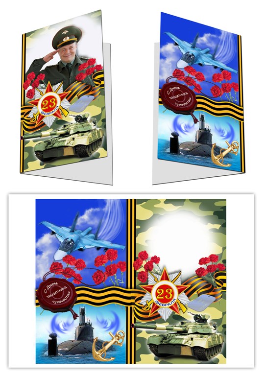 Великолепная открытка к 23-му февраля. Нужно только вставить фотографию в шаблон и можно сразу же нести распечатывать - до праздника как раз успеете.