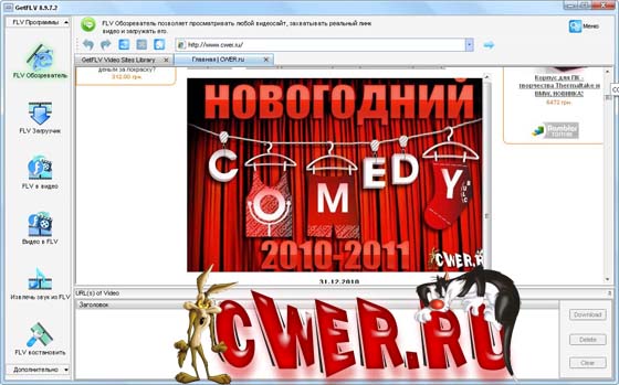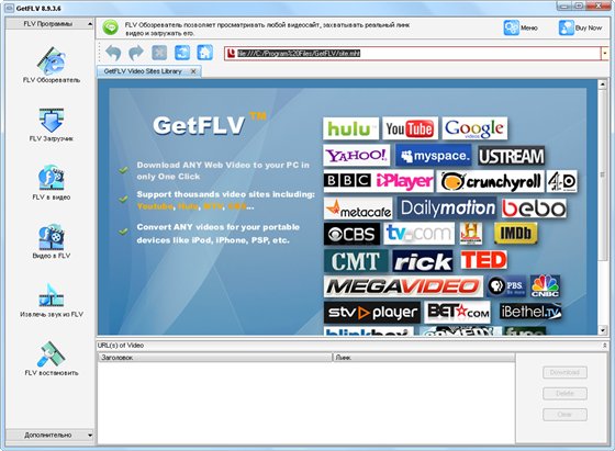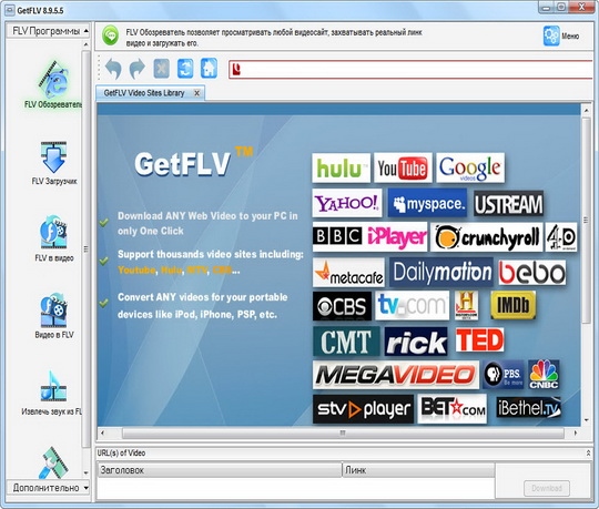 GetFLV Pro - сборник из 7 модулей, который позволяет призводить весь спектр операций с .flv файлами. GetFLV Pro позволяет скачивать, управлять, конвертировать в различные форматы и из различных форматов, извлекать звук, восстанавливать и воспроизводить FLV видео.