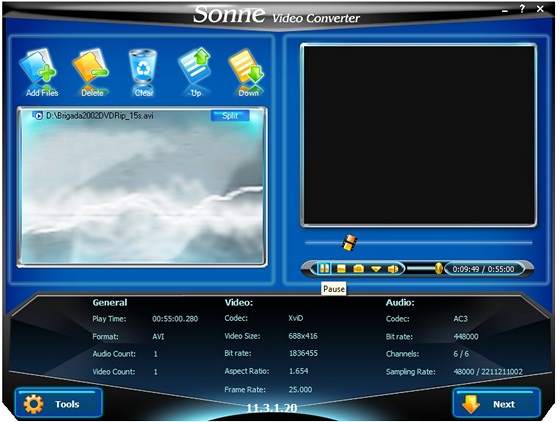 Sonne Video Converter - многофункциональный конвертер с интегрированным редактором и рекордером. Конвертор поможет вам преобразовать нужный файл в определенный формат: AVI, MPEG, MPEG 1, MPEG 2, MPEG 4, VCD, DVD, SVCD, RMVB, RM, WMV и другие видео форматы. Помимо этого утилита позволяет: захватывать видео с DV и Аnalog камер, VCR, TV тюнеров и WEB камер; использовать пакетный режим конвертирования; извлекать аудио дорожки из видео, раскладывать видео на последовательность графических файлов; выбрать и настроить оптимальные кодеки сжатия ваших файлов. Поддерживает большинство пишущих CD/DVD приводов, имеет дружественный интерфейс, высокую скорость конвертации и отличное качество получаемого результата.