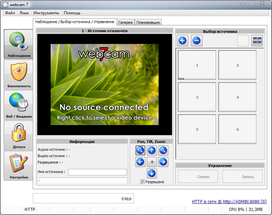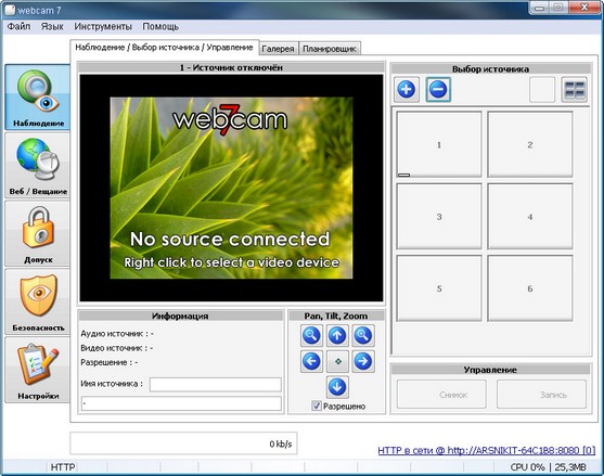 Webcam 7 - мощная программа для работы с веб-камерами, позволяющая предоставить доступ к вашей камере любому пользователю без установки на компьютер специального серверного программного обеспечения. Довольна проста в настройке: в Webcam 7 имеются все необходимые утилиты, поэтому потребуется настроить всего несколько параметров, а именно указать порт сервера и путь к локальной директории. Кроме видеокартинки, получаемой с веб-камер, можно использовать видео, которое передаётся по локальной сети.