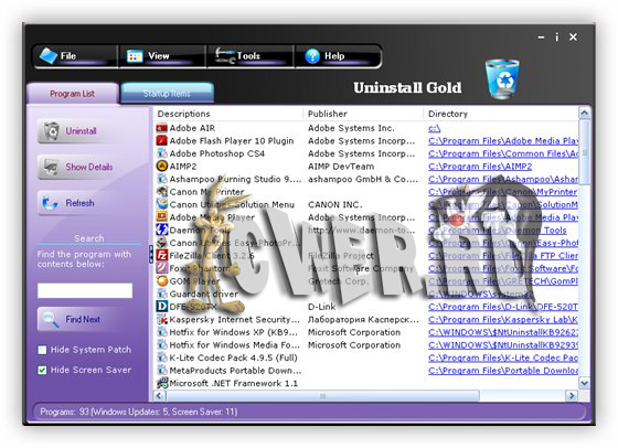 Uninstall Gold- программа для деинсталляции приложений, обладает большим количеством функций: показывает скрытые установленные программы, сортирует список программного обеспечения по заданному фильтру, удаляет некорректно инсталлированные и деинсталлированные программы.
