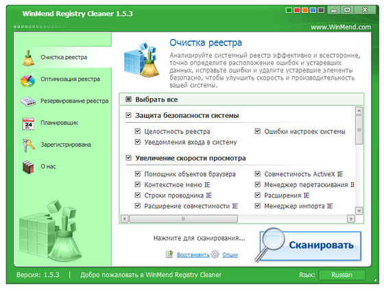 WinMend Registry Cleaner - мощная утилита для очистки реестра и оптимизации приложений. Он состоит из четырёх основные функции модулей: очистка реестра, оптимизация реестра, резервное копировани и планировщик резервного копирования. Программа может эффективно и всесторонне проанализировать систему, точно обнаружить ошибки и устаревшие данные, безопасно устранять или удалять их, таким образом уменьшить нагрузку на ваш компьютер и повысить скорость и производительность системы. Она также анализирует различные параметры системы, такие как, процессор, память, диски и обеспечивает всеобъемлющую статистику.