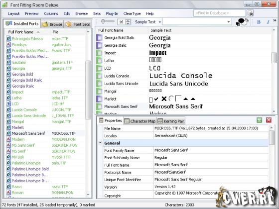Font Fitting Room - это мощный менеджер шрифтов с предварительным просмотром,который поможет тем, у кого имеются обширные коллекции шрифтов. Предназначен для удаления, добавления и организации шрифтов различных форматов. Поддерживает все типы шрифтов, которые используются на компьютерах.