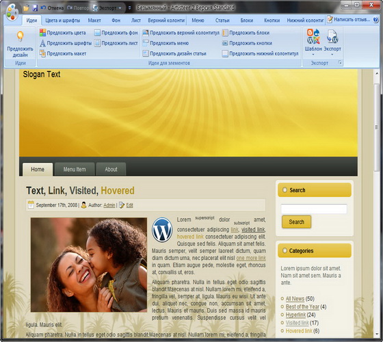 Artisteer - первый и единственный продукт автоматизации веб дизайна, который моментально создает фантастического вида, уникальные шаблоны для СMS Joomla, Drupal, Wordpress, темы для вашего блога или HTML-странички. Проектируйте удивительные темы для Wordpress и создавайте профессиональные вебсайты в считаные минуты.Удобный в использовании.Не требующии знаний Photoshop, CSS, HTML.Экспорт тем в Wordpress,Joomla,Drupal или шаблонов для CMS.