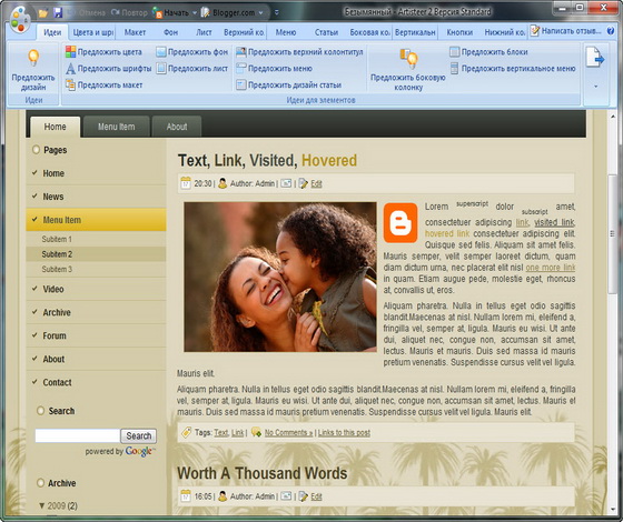 Artisteer - первый и единственный автоматизированный продукт для веб-дизайна, способный мгновенно создать уникальные шаблоны веб-страниц и темы блогов. С помощью Artisteer вы сразу станете экспертом в области веб-дизайна, редактирования и нарезки графики, написания кода XHTML и CSS и создания шаблонов веб-страниц, шаблонов Joomla, тем Drupal и Wordpress, скинов DotNetNuke и шаблонов Blogger за считанные минуты, без использования Photoshop и Dreamweaver и без технической подготовки.
