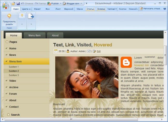 Artisteer - первый и единственный продукт автоматизации веб дизайна, который моментально создает фантастического вида, уникальные шаблоны для СMS Joomla, Drupal, Wordpress, темы для вашего блога или HTML-странички. Проектируйте удивительные темы для Wordpress и создавайте профессиональные вебсайты в считанные минуты. Удобный в использовании. Не требующий знаний Photoshop, CSS, HTML. Экспорт тем в Wordpress, Joomla, Drupal или шаблонов для CMS.