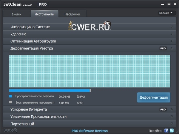 JetClean - простая в использовании, но достаточно мощная программа для удаления системного "мусора", оптимизации и улучшения производительности ПК. С ее помощью можно исправить ошибки реестра, удалить все скопившиеся временные данные, неиспользуемые ярлыки, следы пребывания в Сети, файлы, оставшихся после деинсталляции приложений, а также избавиться от ненужных программ.