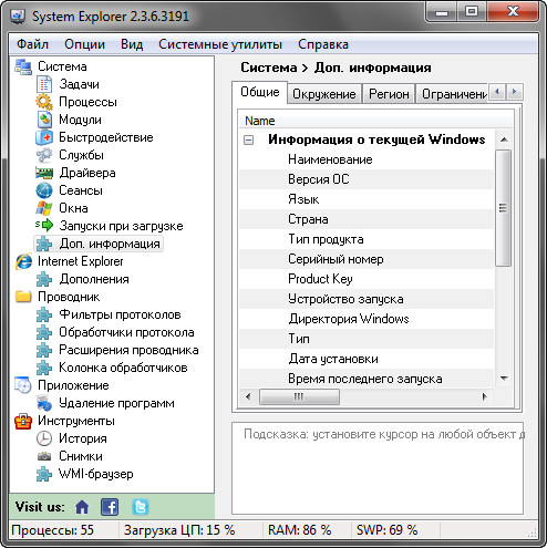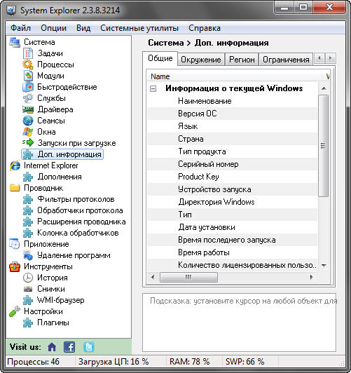 System Explorer - диспетчер задач для Windows. Функциональная, небольшая утилита, способная полностью заменить стандартный диспетчер задач. В System Explorer все строго структурировано и разложено по полочкам. Каждый раздел включает в себя подраздел, в котором и происходят основные манипуляции.