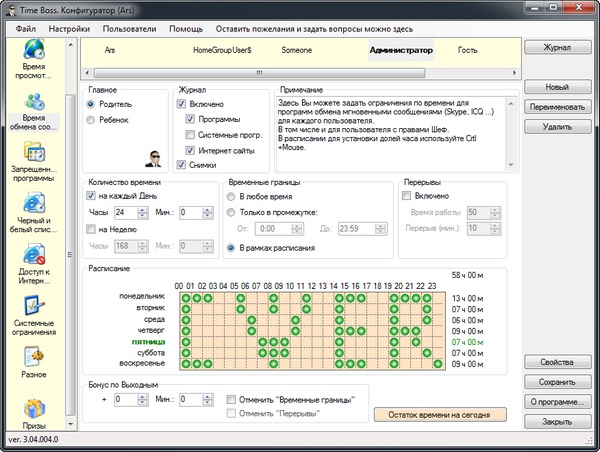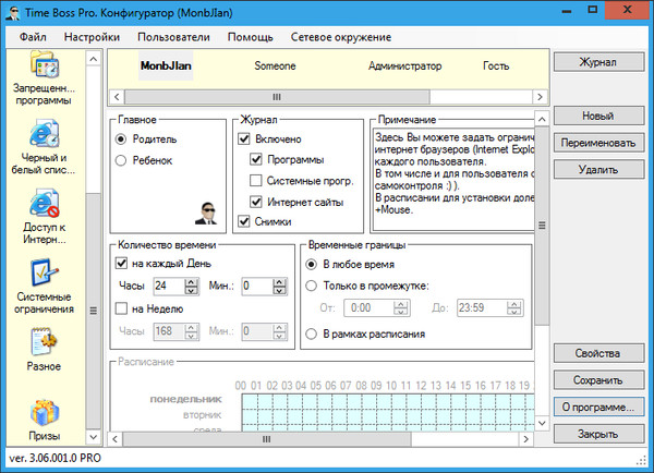 Программа для контроля доступа к компьютеру, которая имеет простой дружелюбный интерфейс и множество полезных функций, использует защиту паролем, ведет журнал компьютерных событий и полную статистику использования. Time Boss позволяет создавать индивидуальные профили для любых пользователей вашего компьютера и указывать, когда и сколько каждый из них может пользоваться компьютером, назначать программы и web-сайты, которые Time Boss должен блокировать.