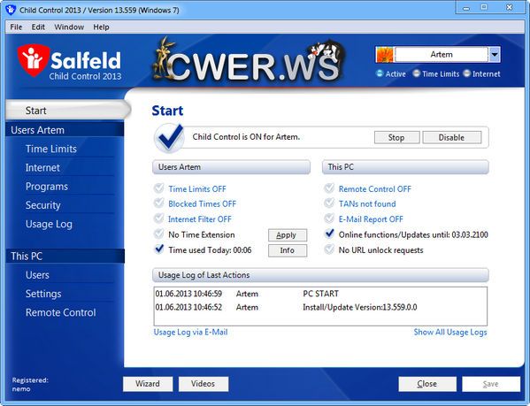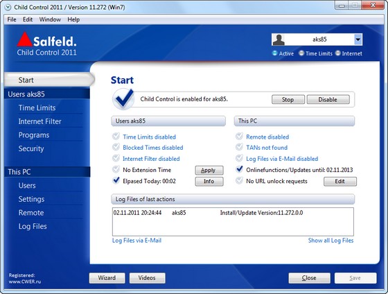 Программа Salfeld Child Control ограничивает время, проводимое вашими детьми за компьютером, как только выделенное им время закончится, компьютер автоматически выключится и повторный вход будет возможен только после ввода пароля. Ограничение можно ввести как по общему времени (например, не более 1 часа в день), так и по периоду времени, когда можно работать (например, с 22:00 до 8:00 доступ запрещен). Кроме этого, программа позволяет запретить посещение нежелательных сайтов, а также заблокировать доступ к определенным дискам и папкам. Программа ведет лог-файл всех событий.