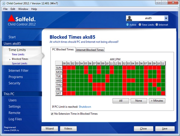 Программа Salfeld Child Control ограничивает время, проводимое вашими детьми за компьютером, как только выделенное им время закончится, компьютер автоматически выключится и повторный вход будет возможен только после ввода пароля. Ограничение можно ввести как по общему времени (например, не более 1 часа в день), так и по периоду времени, когда можно работать (например, с 22:00 до 8:00 доступ запрещен). Кроме этого, программа позволяет запретить посещение нежелательных сайтов, а также заблокировать доступ к определенным дискам и папкам.