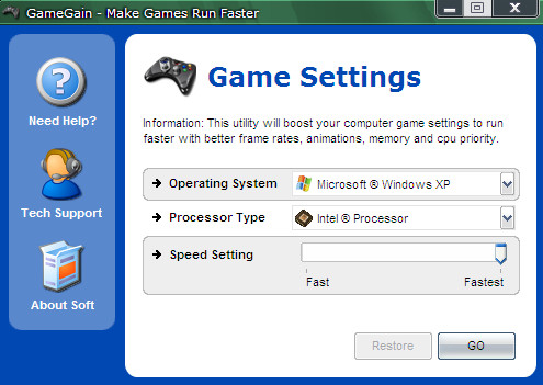 GameGain — программа для увеличения скорости работы игр путем оптимизации компьютера. Увеличивает общую скорость и выжимает производительность вашего компьютера до последнего бита. GameGain вносит изменения в реестр и системные файлы для освобождения оперативной памяти, ускорения прорисовки изображений и использования всех ресурсов процессора. Программа проста в использовании, обладает простым и понятным интерфейсом, совместима со всеми версиями Windows, позволяет непосредственно вносить изменения в реестр, может автоматически выставлять правильные настройки и т.д.