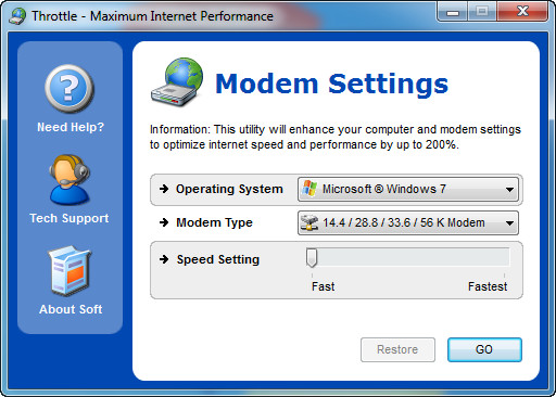 Throttle - утилита предназначена для настройки параметров ваших модемов на максимальное быстродействие, что в результате может привести к более чем 200-процентному увеличению скорости работы. Вы просто выбираете свою OS, тип соединения (14.4/28.8/33.6/56k, кабельный модем, DSL/ADSL модем, ISDN, Satellite, T1/T3/OC3/OC12+, локальная сеть) и нажимаете кнопку "Go". Остальное программа сделает сама! Как отмечают разработчики, программа изменит ряд ключевых параметров работы модема, например, улучшит определение сигнала "занято", уменьшит количество обрывов связи и т.д. Программа работает со всеми типами модемов подо всеми операционными системами семейства Windows.