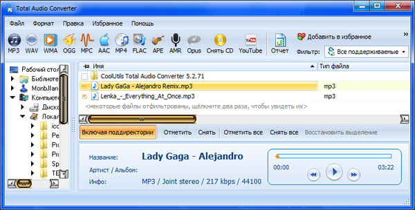 Total Audio Converter — уникальный конвертер, поддерживающий более 30 аудиоформатов. Необходим каждому, кто любит музыку. С его помощью вы сможете легко конвертировать практически любые треки в WAV, MP3, OGG, WMA, APE, FLAC, MP4, AAC, MPC.