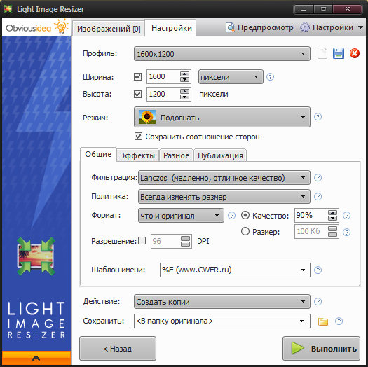 Light Image Resizer - программа для изменения размеров цифровых картинок и изображений в различных графических форматах (на данный момент поддерживается работа с файлами JPEG, GIF, BMP, TIFF, CR2, NEF и т.д.). Также в утилите имеются возможности для компрессии файлов, конвертирования из одного формата в другой, экспорта, наложения и управления картинками.
