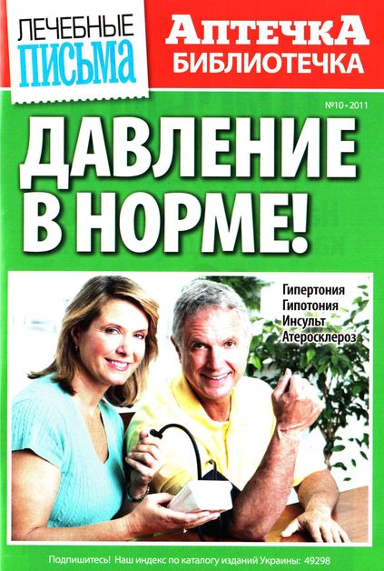 Если вам больше 40 лет и ваше давление выше, чем 140 на 90, этот журнал для вас! Прочитайте его внимательно и поспешите к врачу, но далеко журнал не убирайте. В октябрьском номере вы найдете все, что надо знать о своем давлении. Что означают первая и вторая цифры при измерении давления? Чем грозит высокое артериальное давление и как перестроить жизнь, если поставлен диагноз гипертония? С помощью журнала вы сможете подобрать себе и лечебную диету, и специальную гимнастику, и подходящий аппарат для измерения давления, а также узнаете проверенные рецепты народной медицины.