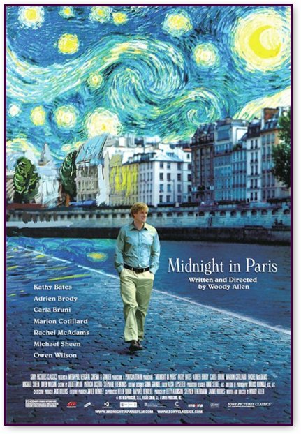 Главный герой фильма Гил (Оуэн Уилсон) мнит себя писателем и мечтает оказаться в Париже 1920-х годов. По ночам Гил без своей невесты совершает прогулки по ночной столице, встречаясь со своими знаменитыми кумирами — Хемингуэем, Фитцджеральдом, Дали, Бунюэлем.