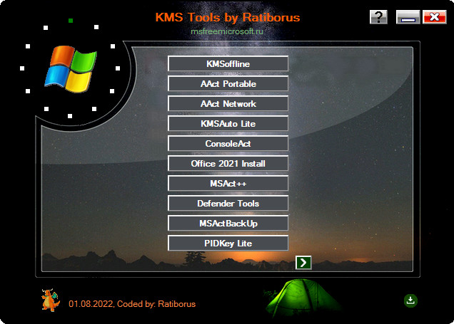 KMS Tools - сборник активаторов от Ratiborus в одной оболочке для Windows XP, Vista, 7, 8, 8.1, 10, Server 2008, 2008 R2, 2012, 2012 R2, Office 2010/2013/2016. Выбираем нужную и сразу можно пользоваться, никакой установки, все полностью портативно. К каждой программе прилагается описание на русском языке. Если есть вопросы по программе, не знаете зачем она нужна, нажимаем справа на вопросик и видим значки рядом с названиями ПО, нажимаем на них и получаем полную информацию.