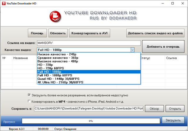 Youtube Downloader HD - бесплатный загрузчик видео. Легко загружайте видео и конвертируйте его в формат AVI или MP4 (совместимый с iPad, iPhone). Вы можете скачать видео высокого качества, видео высокой четкости и Full HD с YouTube.